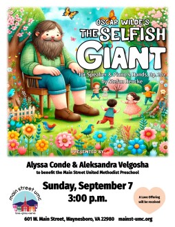 On Sunday, September 7, 2025, Main Street United Methodist Church will present, The Selfish Giant Fairytale for Speaker and Piano 4 hands after Oscar Wilde op. 20a by German composer Stefan Heucke (b. 1959). The performance will feature the talents of Alyssa Conde and Aleksandra Velgosha, both doctoral students in the School of Music at James Madison University. The Rev. Morris Fleischer will provide the narration. The cost is free but a love offering will be received to benefit the Main Street United Methodist Preschool. Doors will open at 2:30 with the forty-five-minute performance beginning at 3:00 p.m. in the sanctuary. Main Street United Methodist Church is located at 601 W. Main Street in Downtown Waynesboro.